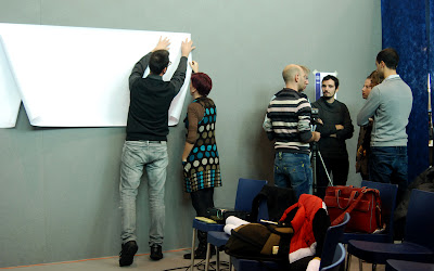 Si trattava di illustrare una serie di concetti su una grande superficie mentre il relatore li esprimeva a voce.